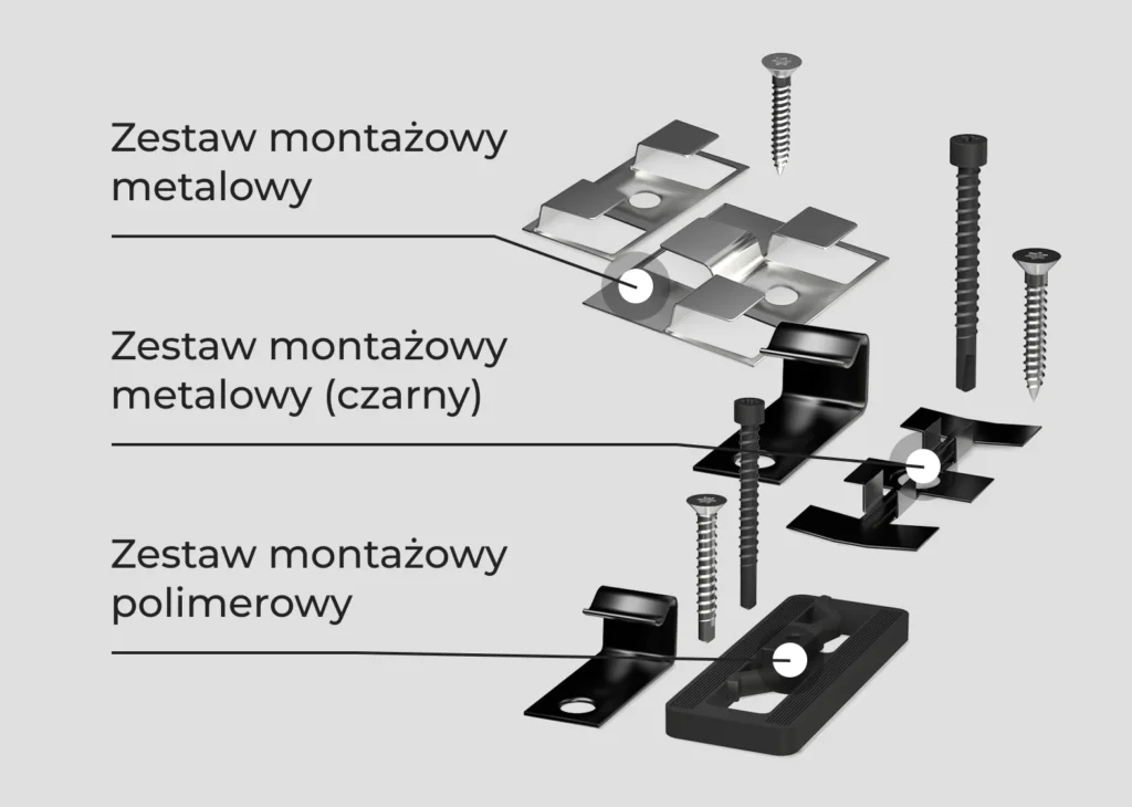| ZESTAW MONTAŻOWY MAŁY (2M2) – 6MM – do mocowania desek do legarów wykonane z atestowanej stali (czarne), zawiera elementy :