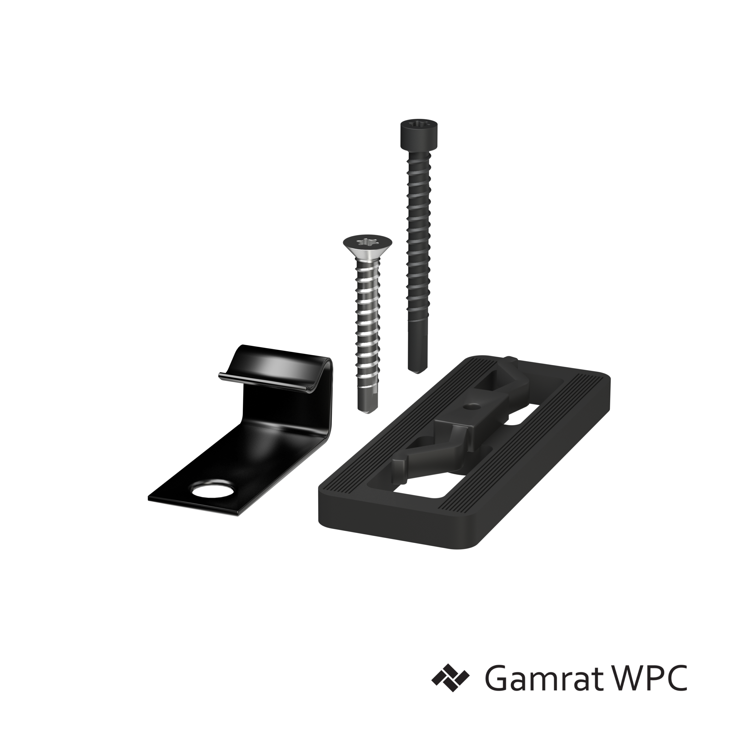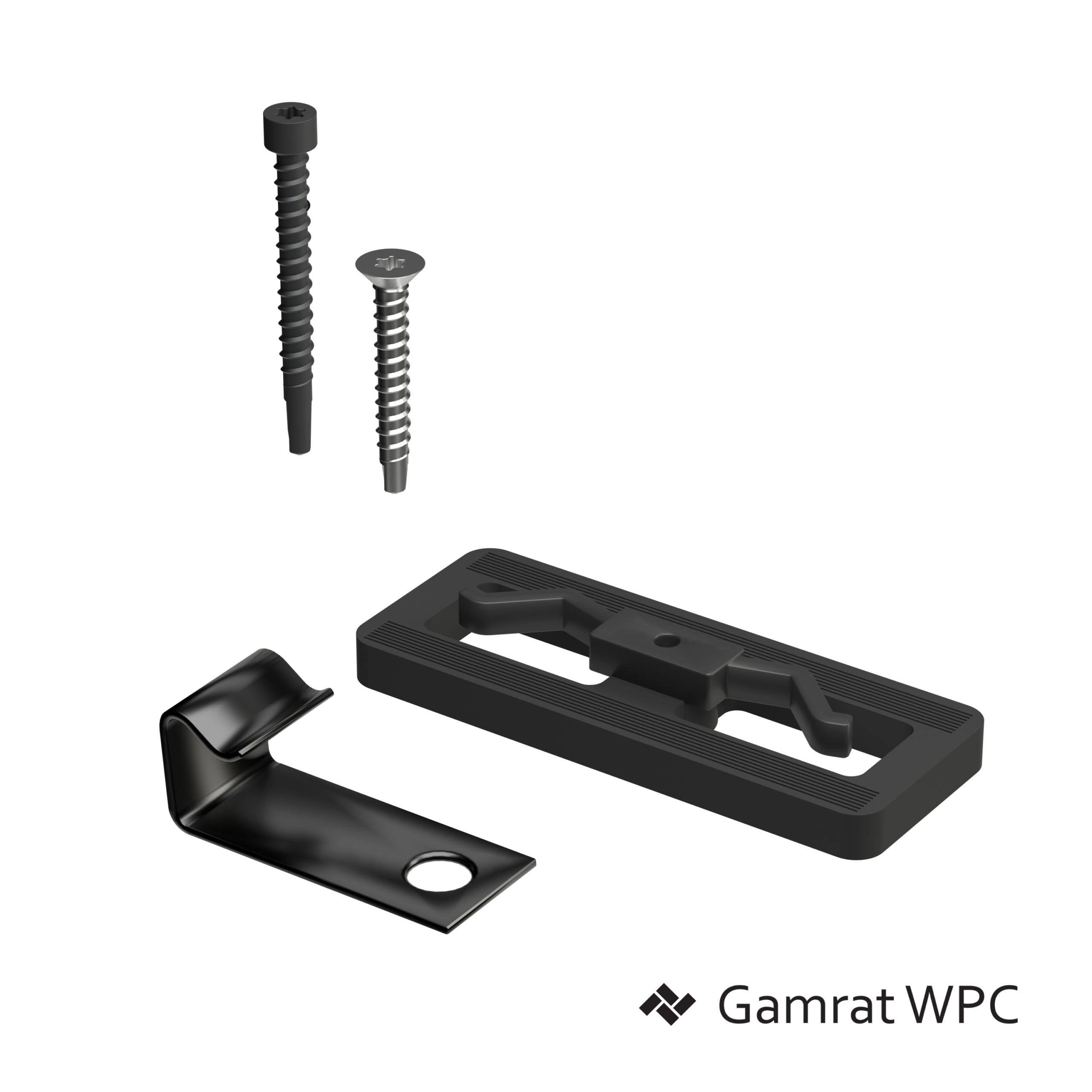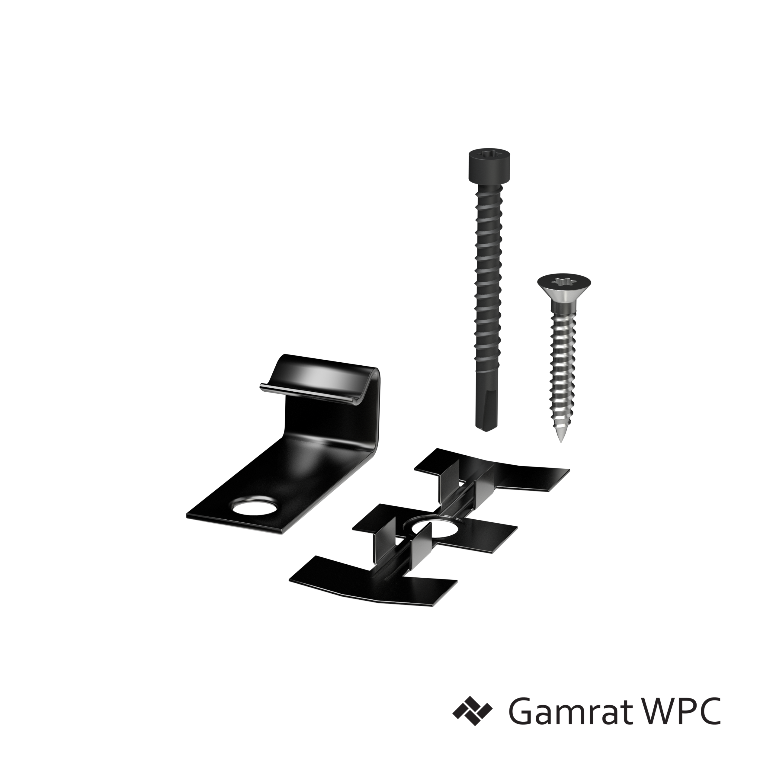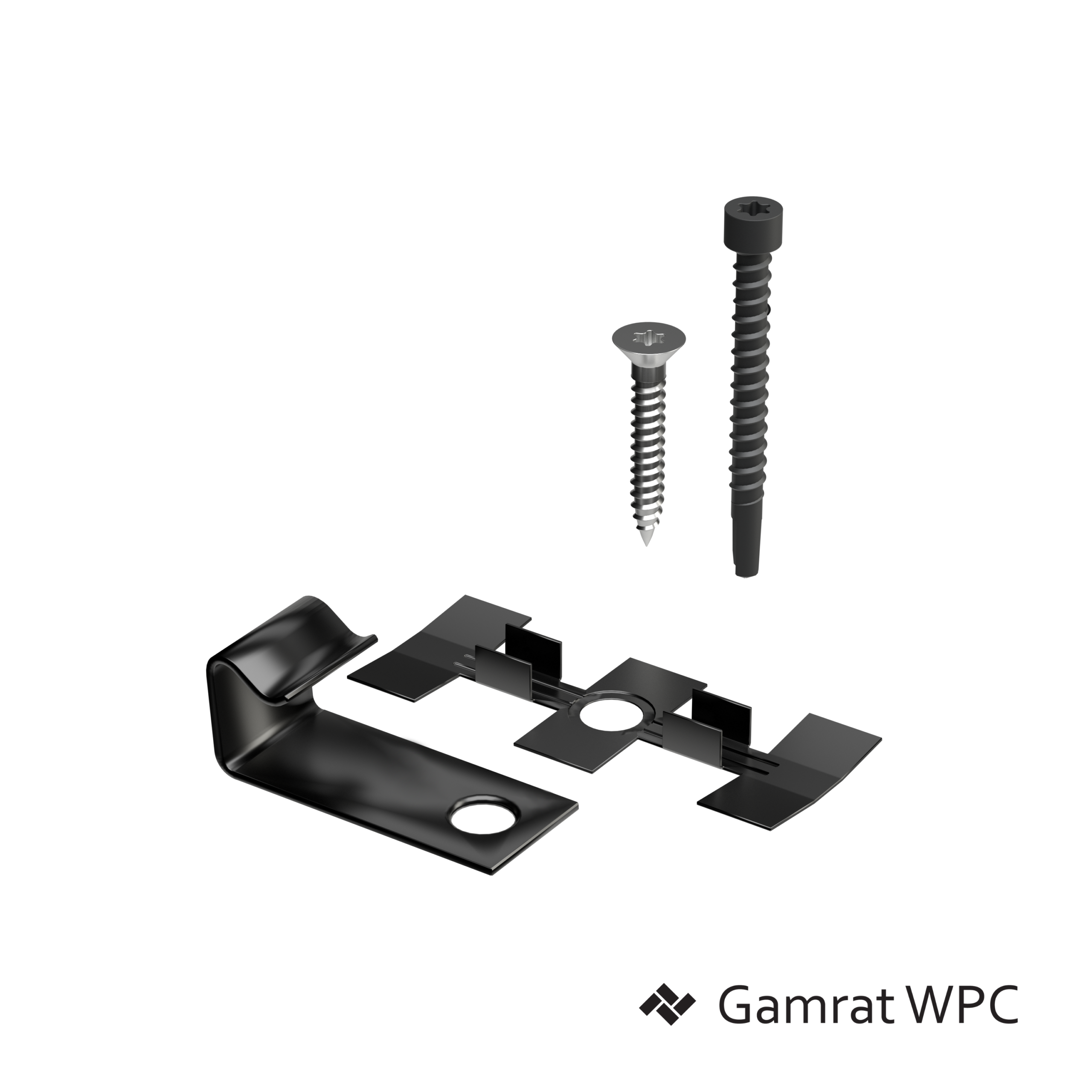 Zestawy montażowe GAMRAT składają się z wysokiej jakości klipsów i wkrętów, gwarantujących solidny i estetyczny montaż tarasów kompozytowych. Wykonane z polimerów.